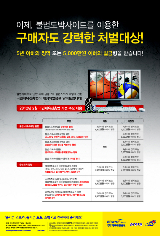 한편 2012년 3월 개정된 국민체육진흥법에 따르면 불법 스포츠도박사이트를 운영자뿐만 아니라 불법 스포츠도박사이트를 통해 베팅만 한 참여자의 경우에도 5년 이하의 징역이나 5000만원 이하의 벌금에 처하도록 변경됐다는 점을 더욱 주의해야 한다.