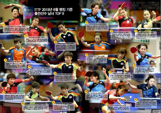 한국은 남녀 국가대표 상비군 등 48명(남 25명, 여 23명)이 출전한다. 남자부는 '맏형 깎신' 주세혁(세계랭킹 16위)을 비롯해 6월 필리핀오픈에서 남자단식 우승컵을 들어올린 실업랭킹 1위, 정영식(세계랭킹 19위) 쑤저우세계선수권 남자복식 3위에 오르며 최근 눈부신 상승세를 보여주고 있는 오픈대회의 사나이 이상수(세계랭킹 24위), 정상은, 김민석, 서현덕 등이 총출동한다. 호주오픈 21세 이하 남자단식 우승에 빛나는 장우진, 독일오픈 21세 이하 남자단식에서 준우승한 김민혁, 지난해 코리아오픈 남자단식 16강에 오른 조승민 등 신세대 에이스들도 모두 나선다. 여자부는 쑤저우세계선수권 혼합복식 금메달, 인천아시안게임 여자단식 동메달리스트인 양하은(세계랭킹 12위)과 '탁구 얼짱' 서효원(세계랭킹 13위) 등 기존 에이스들을 비롯, 크로아티아오픈 여자단식 우승자 최효주, 호주오픈 여자단식에서 준우승한 전지희 등 귀화 에이스들의 활약에 기대가 쏠린다.