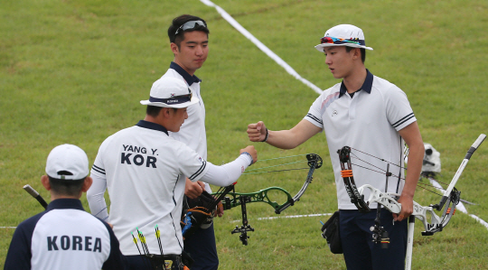 기존의 리커브 활과 달리 컴파운드 활은 양쪽 끝에 원형의 도르래가 달렸다. 활시위를 당길 때에는 힘이 덜 드는 반면 화살 속도는 리커브보다 훨씬 빠르다. 이날 결승전에서 한국대표팀은 강호 멕시코를 상대로 230대229, 극적인 1포인트차 역전승을 거뒀다. 1세트를 57-59로 뒤처졌고, 2세트 115-115, 균형을 맞췄지만, 3세트 172-173으로 다시 1점차 리드를 내줬다. 그러나 4세트 마지막 양영호, 김종호가 침착하게 10점을 꿰뚫으며 기어이 금메달을 목에 걸었다. 마지막 3번째 마무리주자로 나선 김종호는 침착했다. 매번 10점으로 마무리하며 한국대표팀의 뒤를 굳건히 지켰다. "최선을 다하자는 생각뿐이었다. 역전 우승을 확인하는 순간, 울컥했다. 실감이 안난다"고 했다. "마지막 주자로서 책임감을 갖고 했다. 준비한 만큼 하면 좋은 결과가 있을 것이라고 믿었다"고 했다. 양영호는 "팀에 도움이 될 수 있을까 걱정도 많이 했는데 팀원들과 다같이 잘해내서 기쁘다. 응원을 많이 해주셔서 큰힘이 됐다"며 동료들과 팬들에게 고마움을 표했다. 국제대회에서 따낸 첫 금메달의 의미를 묻는 질문에 양영호는 "우리나라 컴파운드를 세계적으로 알리는 데 큰 도움이 됐다. 한국양궁이 리커브뿐 아니라 컴파운드도 금메달을 딸 수 있다는 계기가 돼서 기쁘다"고 말했다. 김태윤은 "마지막까지 우승할 수 있을 걸로 굳게 믿었다. 역전우승을 할 수 있어 기쁘다"며 웃었다. 김태윤은 "컴파운드의 경우 큰 대회 경험이 많지 않다. 우리가 시작점이 돼서 후배들에게 더 많은 기회를 열어줄 수 있으면 좋겠다"는 바람을 밝혔다. 김종호 역시 "2년전부터 본격적으로 컴파운드가 체계적인 훈련을 하게 됐고, 국제무대에도 나서게 됐다. 컴파운드도 리커브처럼 세계 최강이 될 수 있다고 믿는다"고 했다. "이곳 광주에서 컴파운드 양궁을 국민 여러분께 알릴 수 있도록 최선을 다하겠다"는 각오를 다졌다.
