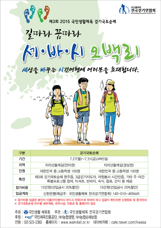 국민생활체육회(회장 강영중)가 청소년을 위한 '제3회 2015 국민생활체육 걷기국토순례'를 개최한다. 걷기국토순례는 청소년들의 체육활동을 장려하기 위해 2012년부터 매년 실시했다.