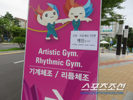'리듬체조 요정' 손연재(21·연세대)가 11일 광주유니버시아드 대회에 출전한다. 광주 시민들 및 리듬체조팬들의 관심이 뜨겁다. 주말인 11~12일을 포함해, 13일까지 광주여대유니버시아드 체육관에서 사흘간 펼쳐지는 리듬체조 경기는 광주U대회 최고의 핫매치다. 전경기 입장권(2만원)이 일찌감치 매진됐다. 경기시작 2시간 전인 12시 무렵부터 주말을 맞아 손연재의 경기를 보기 위해 체육관을 찾은 가족 단위 팬들이 북적였다. 경기장 곳곳에는 '금일 리듬체조 티켓 매진'이라는 안내문이 나붙었다.