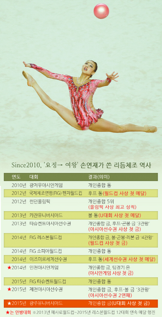 '리듬체조 요정' 손연재(21·연세대)가 또 한번의 역사를 썼다. 대한민국 리듬체조 사상 최초의 유니버시아드 개인종합 금메달을 목에 걸었다. 손연재는 12일 오후 광주여대유니버시아드체육관에서 펼쳐진 리듬체조 개인종합 이틀째 경기, 곤봉 종목에서 18.350점, 리본 종목에서 18.050점을 받았다. 첫날 후프, 볼 종목 중간합계 36.150점와 합산한 총점 72.550점으로 전체 1위에 올랐다. '우크라이나 에이스' 안나 리자티노바가 총점 71.750점으로 은메달, '벨라루스 에이스' 멜라티나 스타니우타가 총점 70.800점으로 동메달을 목에 걸었다. 첫날 나홀로 18점대 고득점을 찍은 손연재는 둘째날 곤봉, 리본 종목에서도 흔들림없는 연기로 1위를 굳건히 지켜냈다. 마지막 곤봉 연기는 압권이었다. 매시즌 경쾌하고 다이내믹함 속에 깜찍한 매력을 선보였던 곤봉 종목에서 손연재는 '델라댑 치가니' 레퍼토리에 맞춰 완벽한 연기를 선보였다. 그녀의 트레이드 마크, 곤봉을 머리에 얹고 걷는 리드믹스텝에서 관객들의 뜨거운 탄성이 쏟아졌다. 18.350점, 사상 첫 유니버시아드 금메달의 역사를 개인 최고점으로 마무리했다. .