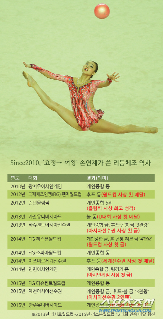 '리듬체조 요정' 손연재가 또 한번의 역사를 썼다. 대한민국 리듬체조 사상 최초의 유니버시아드 개인종합 금메달을 목에 걸었다. 손연재는 12일 오후 광주여대유니버시아드체육관에서 펼쳐진 리듬체조 개인종합 이틀째 경기, 곤봉 종목에서 18.350점, 리본 종목에서 18.050점을 받았다. 첫날 후프, 볼 종목 중간합계 36.150점와 합산한 총점 점으로 전체 1위에 올랐다. '우크라이나 에이스' 안나 리자티노바가 총점 71.750점으로 은메달, '벨라루스 에이스' 멜라티나 스타니우타가 총점 70.800점으로 동메달을 목에 걸었다. 첫날 나홀로 18점대 고득점을 찍은 손연재는 둘째날 곤봉, 리본 종목에서도 흔들림없는 연기로 1위를 굳건히 지켜냈다. 마지막 곤봉 연기는 압권이었다. 매시즌 경쾌하고 다이내믹함 속에 깜찍한 매력을 선보였던 곤봉 종목에서 손연재는 '델라댑 치가니' 레퍼토리에 맞춰 완벽한 연기를 선보였다. 그녀의 트레이드 마크, 곤봉을 머리에 얹고 걷는 리드믹스텝에서 관객들의 뜨거운 탄성이 쏟아졌다. 18.350점, 최고점이 발표됐다. 금메달을 확신했다. "손연재! 손연재!" 7000여 관중들이 손연재의 이름을 한목소리로 호명했다. 손연재는 힘든 시간을 함께 버텨낸 옐레나 리표르도바 코치, 트레이너 송재형 원장과 뜨겁게 포옹했다. 지난해 인천아시안게임, 올해 제천아시아선수권에 이어 광주에서도 금메달을 놓치지 않았다. '안방불패'의 비결은 '끝까지'였다. '끝까지' 꼿꼿이 유지한 집중력이었다. 전종목 4종목에서 클린 연기로 18점대를 기록했고, 전종목에서 1위에 올랐다. 라이벌들은 실수했고, 손연재는 실수하지 않았다.