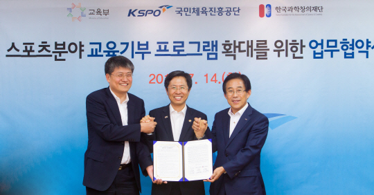 국민체육진흥공단이 15일 교육부, 한국과학창의재단과 '스포츠분야 교육기부 확대를 위한 업무협약'을 체결했다. 이창섭 국민체육진흥공단 이사장과 김재춘 교육부 차관, 김승환 한국과학창의재단 이사장 등 관계자들은 이날 협약식을 갖고 협력을 다짐했다.