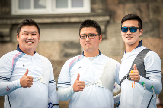 남자 리커브 단체전에서 금메달을 합작한 오진혁과 김우진 구본찬.(왼쪽부터) 사진출처=세계양궁연맹페이스북