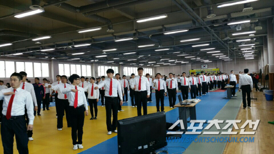 ◇지난 2월 선문대학교 아산캠퍼스에서 진행된 2015 국민생활체육 전국합기도연합회의 제1차 심판&경기 지도자 연수교육에 참가한 합기도 지도자들이 경기 판정 동작을 연습하고 있다. 사진=전국합기도연합회 제공