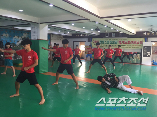 두터운 매트가 깔린 체육관에 3열로 늘어선 20명의 예산 지역 중고등학생들은 맨 앞에 선 정 관장의 설명과 시연 동작을 차례로 따라했다. 우렁찬 기합소리를 내질렀지만, 동작은 어설펐다. 처음이니 당연하다. 그러나 정 관장이 일일히 아이들 옆에 다가가 올바른 자세로 고쳐주면서 낙법의 요체에 관해 설명했다.