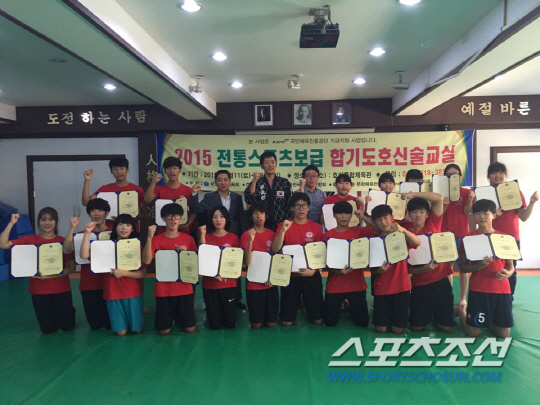 ◇15일 충남 예산군 예산읍 호키체육관에서 진행된 '2015 전통스포츠보급 합기도 호신술교실'에 참가한 지역 청소년들이 수료장을 든 채 파이팅을 외치고 있다. 예산=이원만 기자wman@sportschosun.com