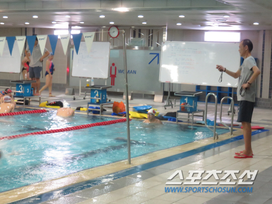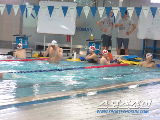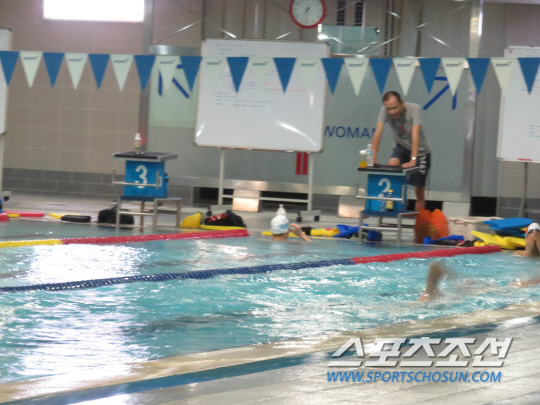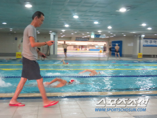 노민상 감독이 박태환을 따라가며 초를 재고 있다. 50m씩 끊어 반복훈련하는 메인세션에서. 박태환의 훈련파트너는 노민상 꿈나무 교실의 고등학생 선수다.