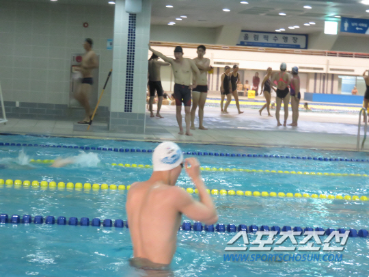 수영선수들은 격렬한 메인세션 전후로 근육을 이완시키기 위한 웜업, 웜다운을 해줘야 한다. 8시 곧바로 이어지는 아쿠아로빅 수업, 수강생 등 틈에서 꿋꿋이 웜다운하고 있는 박태환.