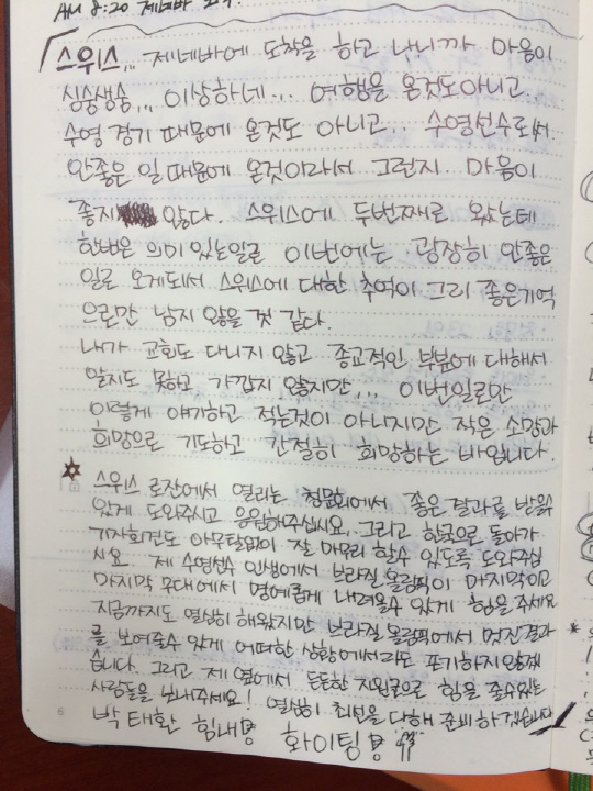 박태환이 지난 3월 FINA청문회를 앞두고 간절한 마음으로 적어내린 일기.