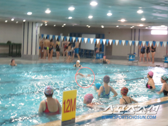 훈련하는 박태환을 수영장 회원들이 멀리서 지켜보고 있다.