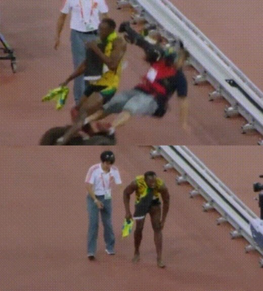 그러나 이 과정에서 이륜 바이크 위에 올라선 카메라 기자는 균형을 잃고 넘어지면서 우사인 볼트를 그대로 덮쳤고, 볼트는 한바퀴를 구른 후 다리를 쩔뚝거리며 일어났다.