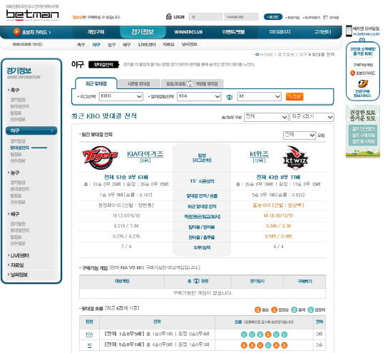 베트맨에서 제공하는 서비스 중 가장 많은 인기를 끌고 있는 코너는 경기를 치르는 상대팀간의 맞대결 정보다. 베트맨의 경기정보 코너의 맞대결 전적을 보면 야구, 축구, 배구, 농구 등 다양한 종목별로 원하는 팀간의 최근 성적은 물론, 시즌별 맞대결 등의 기록을 자세하게 비교해 볼 수 있다. 게다가 토토와 프로토 게임의 대상경기로 지정됐을 당시의 맞대결 정보까지 제공하기 때문에 토토팬들에게는 없어서는 안될 중요한 코너로 자리매김 하고 있다. 경기정보 코너에서는 종목별 선수는 물론 팀의 상세정보와 순위, 역대 성적까지 다양한 경기정보와 분석정보를 제공해 스포츠의 숨겨진 재미를 발견 할 수 있다.