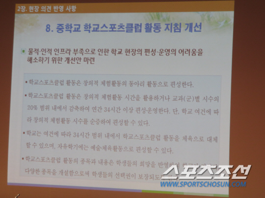 교육부는 8~9월 2차례에 걸쳐 2015 개정교육과정 총론 시안에 대한 공청회를 열었다. 9월 말 고시를 앞두고 공개된 체육 과목 개정 시안에 따르면 중학교 학교스포츠클럽의 경우 3년간 총 136시간 편성 단서조항이 삭제됐다. '연간 34시간 이상 편성,운영한다'로 바뀌었다. 3년간 총 102시간만 운영해도 되도록 완화한 것이다.
