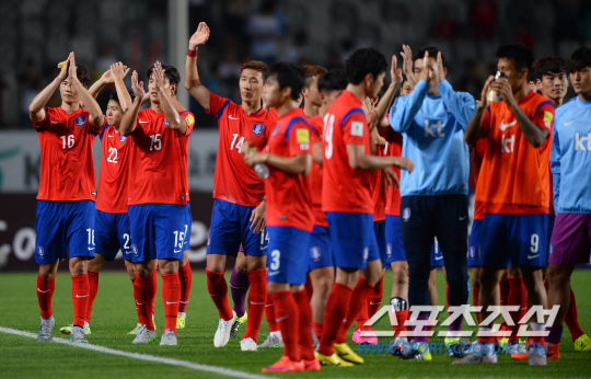 슈틸리케 감독이 이끄는 축구 국가대표팀이 3일 오후 경기도 화성종합경기타운에서 라오스를 상대로 '러시아월드컵 아시아지역 2차예선' 경기를 펼쳤다. 대한민국이 라오스를 상대로 8대0 대승을 거뒀다. 경기 종료 후 팬들에게 인사를 하고 있는 선수들. 화성=송정헌 기자 songs@sportschosun.com/2015.09.03