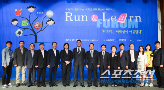 스포츠조선 여학생 체육 활성화-RUN&LEARN' 포럼(스포츠조선-대한체육회 주최, 교육부 후원)이 15일 서울 방이동 올림픽파크텔에서 열렸다. 귀빈들이 함께 무대에 올라 기념촬영을 하고 있다. 정재근 기자 cjg@sportschosun.com/2015.09.15/