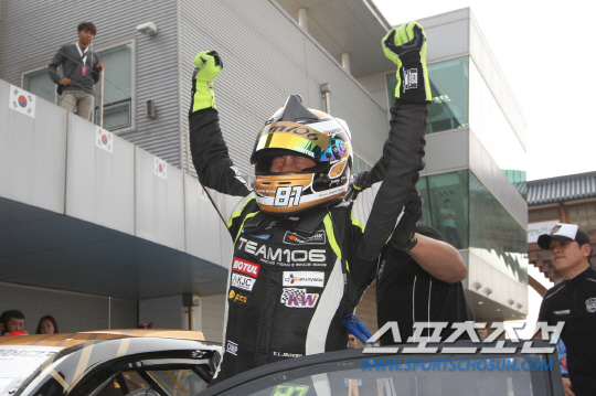 20일 전남 영암 코리아인터내셔널서킷서 열린 슈퍼레이스 챔피언십 슈퍼 6000클래스 7라운드 결선에서 데뷔 후 첫 우승을 차지한 정연일(팀106)이 두손을 번쩍 들어 기쁨을 나타내고 있다. 사진제공=슈퍼레이스