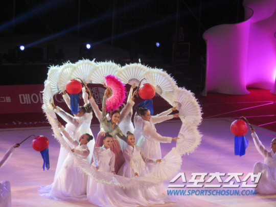 손연재가 한가위를 맞아 리듬체조 팬들을 위해 '한국적인 무대'를 준비하겠다고 한 약속대로였다. 세계를 호령하는 러시아 리듬체조 에이스들이 가장 한국적인 '아리랑' 선율에 한복, 부채춤을 선보이는 모습은 이채로웠다. 5년째를 맞는 리듬체조 갈라쇼, 리듬체조와 한국의 춤이 합쳐진 이색적인 무대에 팬들은 뜨거운 박수를 보냈다. 전영지 기자 sky4us@sportschosun.com