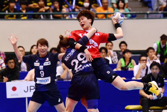 ◇류은희(가운데)가 25일 일본 아이치현 나고야의 아이치현체육관에서 열린 일본과의 2016년 리우데자네이루올림픽 아시아지역 예선 최종전에서 상대 수비수 마크를 뚫고 슛을 시도하고 있다. 나고야(일본)=사진공동취재단