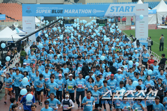 장애인과 비장애인이 함께 달리는 슈퍼블루마라톤이 24일 잠실올림픽주경기장에서 펼쳐졌다. 참가자들이 힘차게 출발하고 있다. (사)스페셜올림픽코리아(회장 나경원)와 롯데그룹이 공동 주최하고 스포츠조선이 주관하는 이번 대회는 슈퍼블루 캠페인 프로그램의 하나로 올해 첫 발을 내딛는다. 슈퍼블루 캠페인은 지난 2013년 (사)스페셜올림픽코리아와 롯데그룹이 시작한 행사로 장애인에 대한 인식을 개선하고, 장애인이 자립할 수 있도록 지원하는 사회공헌활동이다. 슈퍼블루는 이 캠페인의 상징색이다. 대회 코스는 두 곳이다. 잠실 올림픽주경기장을 출발해 청담대교를 지나 돌아오는 5km 코스(슈퍼블루 코스)와 같은 장소에 출발해 천호대교에서 돌아오는 10km 코스다. '모두가 승리자'라는 스페셜올림픽의 철학을 담아내기 위해 치열한 경쟁이 아닌 흥겨운 축제 분위기 속에서 펼쳐진다. 잠실=허상욱 기자 wook@sportschosun.com