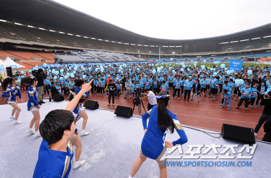 장애인과 비장애인이 함께 달리는 슈퍼블루마라톤이 24일 잠실올림픽주경기장에서 펼쳐졌다. 참가자들이 식전 행사에서 치어리더와 함께 몸을 풀고 있다. (사)스페셜올림픽코리아(회장 나경원)와 롯데그룹이 공동 주최하고 스포츠조선이 주관하는 이번 대회는 슈퍼블루 캠페인 프로그램의 하나로 올해 첫 발을 내딛는다. 슈퍼블루 캠페인은 지난 2013년 (사)스페셜올림픽코리아와 롯데그룹이 시작한 행사로 장애인에 대한 인식을 개선하고, 장애인이 자립할 수 있도록 지원하는 사회공헌활동이다. 슈퍼블루는 이 캠페인의 상징색이다. 대회 코스는 두 곳이다. 잠실 올림픽주경기장을 출발해 청담대교를 지나 돌아오는 5km 코스(슈퍼블루 코스)와 같은 장소에 출발해 천호대교에서 돌아오는 10km 코스다. '모두가 승리자'라는 스페셜올림픽의 철학을 담아내기 위해 치열한 경쟁이 아닌 흥겨운 축제 분위기 속에서 펼쳐진다. 잠실=송정헌 기자 songs@sportschosun.com