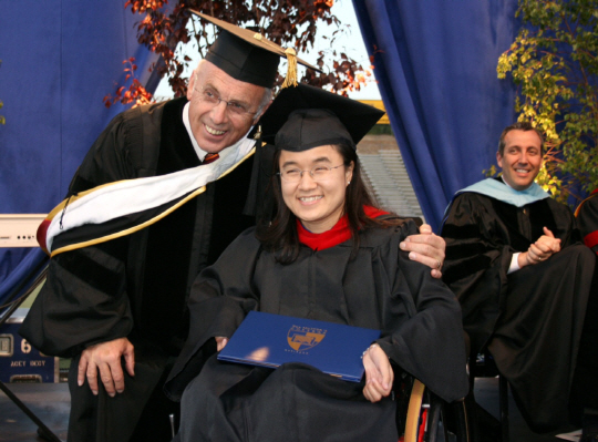 2007년 미국 캘리포니아 매스터스컬리지 졸업식, 존 맥아더 총장과 함께 활짝 미소짓고 있는 김소영 센터장. 사진제공=김소영