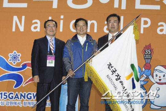 11월 1일 오후 4시에 강릉실내종합체육관에서 열린 제35회 전국장애인체육대회 폐회식에서 충청남도 허승욱 정무부지사(사진 가운데)가 대회기를 전달받고 기념사진을 찍고 있다. 사진제공=대한장애인체육회