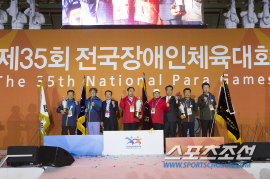 11월 1일 오후 4시에 강릉실내종합체육관에서 열린 제35회 전국장애인체육대회 폐회식에서 종합시상 후 기념촬영을 하고 있다. 종합 1위 경기도(사진 가운데), 2위 서울(사진 맨 왼쪽), 3위 대전(사진 맨 오른쪽) 사진제공=대한장애인체육회