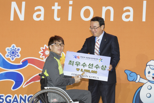11월 1일 오후 4시에 강릉실내종합체육관에서 열린 제35회 전국장애인체육대회 폐회식에서 수영의 조기성(부산)이 대회 최우수선수상을 수상하고 있다. 사진제공=대한장애인체육회