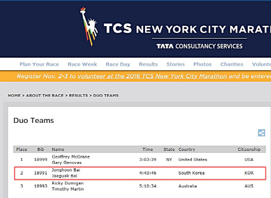 뉴욕마라톤 주최측은 배재국군(20대전고)과 아버지 배종훈씨(50)를 위해 올해부터 듀오팀 부문을 새로이 창설했다. 30일 뉴욕행 비행기에 오른지 사흘만인 지난 2일(한국시각), 꿈을 향한 혼신의 마라톤, 아버지와 아들은 완주에 성공했다. 뉴욕마라톤 공식 홈페이지 확인 결과 4시간43분46초의 기록으로 결승선을 통과했다. 듀오팀으로 출전한 3팀 가운데 2위의 기록이다. 스무살 근육병 아들의 휠체어를 밀며, 경직된 아이의 다리를 주무르며, 아버지는 5시간 가까이 달리고 또 달렸다. 아들에게 큰세상을 보여주겠다던 약속을 지켰다.