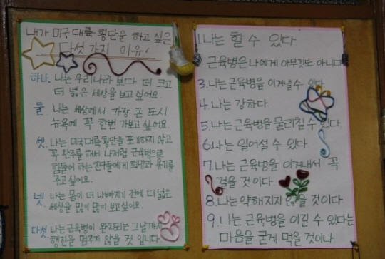 이들 부자에게 뉴욕마라톤이 그렇게 간절했던 이유는 무엇일까. 재국군은 "세계에서 가장 큰 도시라서, 꼭 가보고 싶었다"고 했다. "일단 마라톤을 완주한 후, 타임스퀘어도 가보고 싶고, 자유의 여신상, 유엔본부도 보고 싶고, 반기문 총장님도 만나고 싶다." 아버지는 말했다. "첫번째 이유는 넓은 세상을 보여주겠다는 아들과의 약속을 지키기 위해서다. 두번째는 근육병을 알리고, 근육병 친구들에게 용기와 희망, 포기하지 말자는 메시지를 주기 위해서다. 하루빨리 치료약이 나오길 바란다."