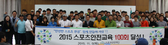 스포츠안전재단(이사장 강영중)이 5일 체육인재육성재단 주관, 용인현대인재개발원(경기도 용인시)에서 학교운동부 지도자 200여명을 대상으로 2015 스포츠안전교육 100회째를 실시했다.