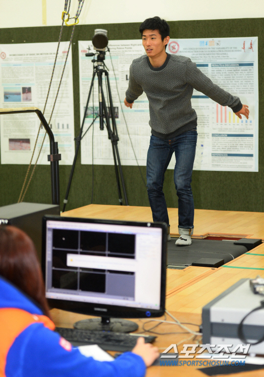 양학선이 운동동작 분석연구 수업시간, 지면발력기 실험에 참가하고 있다 있다. 송파 한국체대=최문영 기자deer@sportschosun.com /2015.11.05/