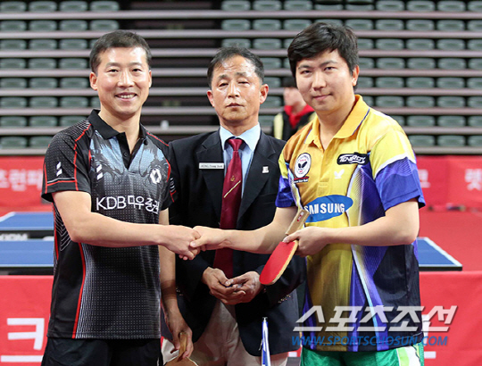 김택수 KDB대우증권 감독이 15일 서울 장충체육관에서 펼쳐진 렛츠런파크 '탁구더비'중 유승민 삼성생명 코치와 시범경기를 펼쳤다. 한국마사회가 올해 처음으로 기획한 '탁구더비'는 엘리트 탁구단을 운영하는 기업이 생활탁구 활성화를 위해 솔선수범한 좋은 예다. 전국에서 운영 중인 렛츠런CCC.(문화공감센터)를 거점으로 예선을 거친 234개 팀, 총 468명이,가족, 실버, 화목 총 3개 부문으로 나뉘어 열전을 펼쳤다. 현정화 감독이 이끄는 렛츠런탁구단은 지난 여름 내내 전국 20개 지점을 돌며, 동호인 대회를 이끌었고, 이날 대회를 통해 전국 축제의 장을 열었다.