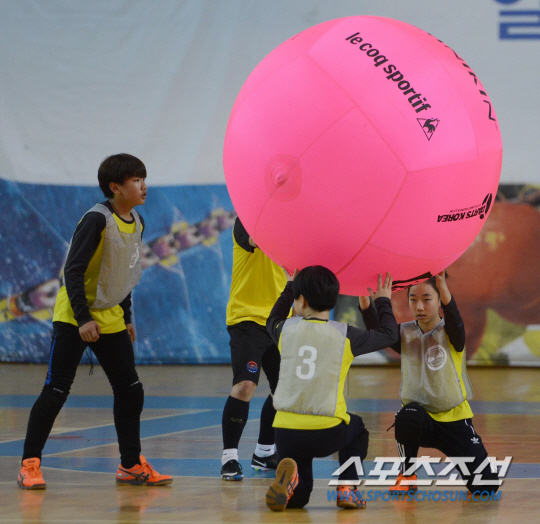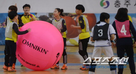 킨볼은 올해 처음으로 학교스포츠클럽 대회 정식종목으로 채택됐다. '협동 존중 참여'를 추구하는 킨볼의 정신, 교육적 가치를 인정받았다. 1984년 캐나다 체육교사 마리오 뒤마가 창시한 킨볼은 남녀노소 누구나 즐길 수 있고, 운동을 잘하든 못하든 소외되지 않고, 모두가 함께 참여하고 서로를 배려하는 대표적인 뉴스포츠 종목이다. 지름 1.22m의 '핫핑크' 초대형볼, 흔한 맞대결이 아닌 세 팀이 격돌하는 방식이 호기심을 자극한다. 핑크, 그레이, 블랙 3팀으로 나뉜다. 4명의 선수들이 볼을 받쳐들고 공을 받을 팀을 지명한 후 1명의 히터가 강서브를 날린다. 공격팀은 수비팀을 결정한 후 "옴니킨(Omnikin)!"과 함께 팀명을 큰소리로 외친다. '옴니킨!'은 '모두 함께'를 뜻하는 '옴니(Omni)'와 신체를 뜻하는 '킨(kin)'의 합성어다. '모든 참가자가 함께 하는 신체놀이'라는 뜻이다. 그레이팀이 "옴니킨 핑크!"를 외친 후 공격에 성공할 경우, 그레이팀은 물론, 공수에 가담하지 않은 블랙팀도 '어부지리'로 득점한다. 1위 팀은 '가장 약한' 3위팀을 공격할 수 없다. 약자도, 강자도 끝까지 함께하는 경기다. 거침없이 몸을 던지며 "옴니킨!"을 외치는 '킨볼 남녀'들 사이에서 '열혈' 여학생들의 활약은 단연 눈에 띄었다.