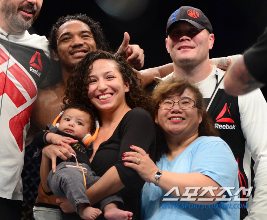 28일 서울 방이동 올림픽 체조경기장에서 'UFC 파이트 나이트 서울(UFN79)'이 열렸다. 추성훈, 김동현, 벤슨 헨더슨 등 국내에서 가장 인기 있는 파이터들이 출전했다. 벤슨 헨더슨- 조지 마스비달의 경기가 열렸다. 헨더슨이 마스비달에 판정승을 거뒀다. 힘차게 타격하고 있는 헨더슨. 경기 종료 후 가족, 동료들과 함께 기념 포즈를 취하고 있는 헨더슨. 송정헌 기자 songs@sportschosun.com/2015.11.28
