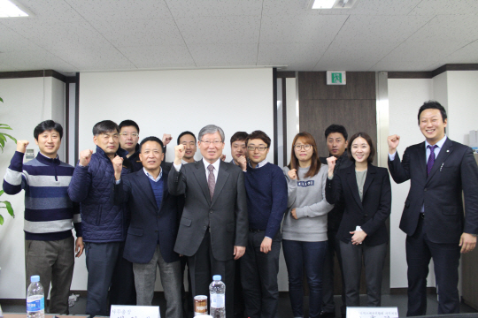 2015 스포츠안전 전문가 2차 해외연수 워크숍 자리에서 박영대 사무총장과 연수생들이 함께 파이팅을 외치고 있다. 사진제공=스포츠안전재단