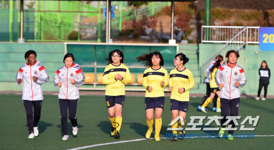 이현영 쁘레치냐 등 이천 대교 에이스들이 축구를 좋아하는 이천여자어린이FC 여학생들과 함께 달리고 있다. 이천=김경민 기자 kyungmin@sportschosun.com / 2015.11.12.