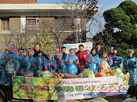 국가대표 1004 봉사단은 6일 서울 종로구 뿌리의집에서 미혼모 및 한부모 가정 지원을 위한 희망의 김장담그기 봉사를 위해 팔을 걷었다. 1988년 서울올림픽 탁구 금메달리스트 유남규 단장을 비롯해, 장윤창, 유애자(배구), 양종옥(유도), 한현숙, 오성옥, 홍정호(핸드볼), 홍차옥, 김무교, 조언래(탁구), 임춘애, 문선정(육상), 백현만, 문영생(복싱), 홍성균(조정), 남현희(펜싱), 에쓰오일 탁구단 등 30여명의 역대 올림픽 메달리스트들과 스포츠 스타들이 참석해 총 800포기의 김장김치를 담갔다. 이날 정성껏 만들어진 김장 김치는 미혼모 및 한부모 가정에게 배 될 예정이다.