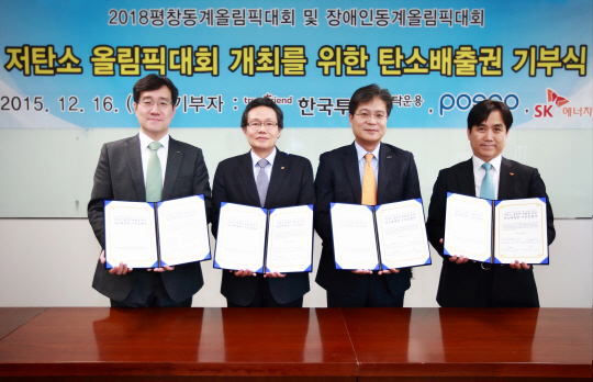 2018년 평창 동계올림픽대회 및 장애인동계올림픽대회 조직위원회는 16일 서울 중구 조직위 서울사무소에서 포스코와 SK에너지 등 3개 기업으로부터 UNFCCC CDM(유엔기후변화협약 청정개발체제)사업 탄소배출권 7만5321톤을 기부 받았다.