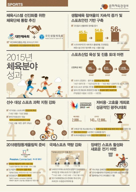 문화체육관광부(이하 문체부)는 2015년도 문화예술, 콘텐츠산업, 체육, 관광 분야의 성과를 각각 정리한 '문화융성 정책성과 결산' 시리즈를 발표했다. 체육 분야에선 문체부 주도하에 엘리트 체육(대한체육회)과 생활체육(국민생활체육회)으로 이원화 돼 있던 체육단체의 통합을 추진했다. 또 스포츠가 문화융성과 창조경제를 이끄는 견인차가 될 수 있도록 안전한 체육활동 환경 조성, 국민생활체육 참여율 증가, 스포츠산업 육성, '2018년 평창동계올림픽대회 준비' 등에 힘썼다. 지난 3월 국민체육진흥법이 개정돼 대한체육회와 국민생활체육회의 통합을 위한 법적 토대가 마련됐다. 체육단체가 통합될 경우 우수선수의 발굴 육성을 위한 선수 저변이 확대되고 생활체육의 활성화로 체육 분야 일자리가 늘어나는 등 스포츠강국에서 스포츠선진국으로 발돋움할 수 있는 기반이 만들어질 것으로 예상된다.