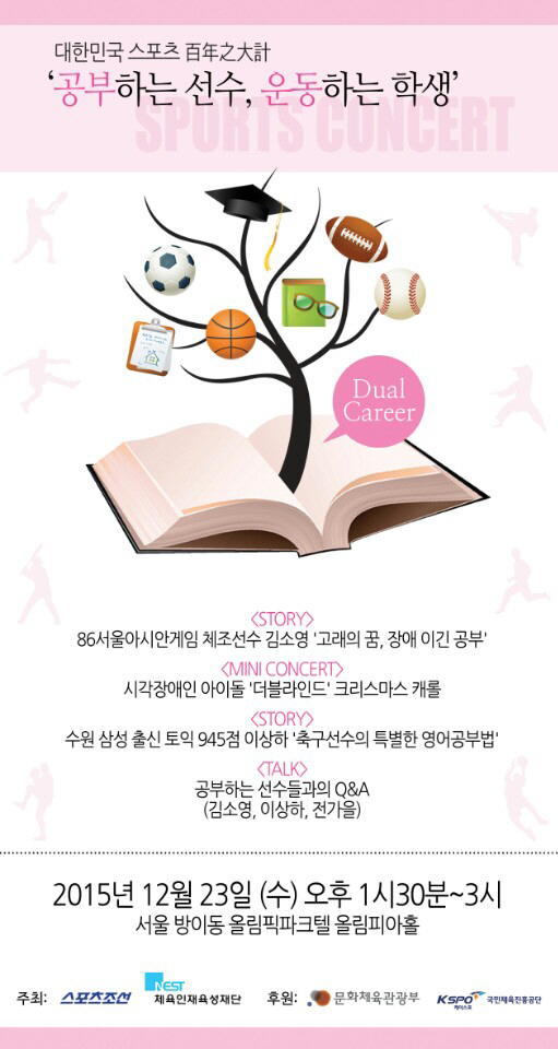 2015 크리스마스 시즌, 공부하는 선수들을 위한 스포츠 콘서트에 각급 학교의 관심이 뜨겁다. 스포츠조선은 체육인재육성재단과 함께 23일 오후 1시30분부터 3시까지 서울 방이동 올림픽파크텔 올림피아홀에서 '대한민국 스포츠 백년지대계-공부하는 선수, 운동하는 학생' 스포츠 콘서트(문화체육관광부-국민체육진흥공단 후원)를 개최한다.
