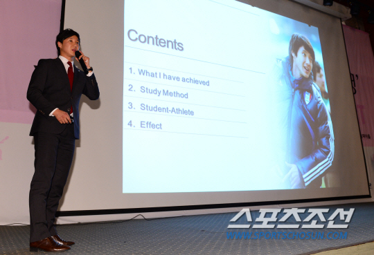 23일 오후 서울 방이동 올림픽파크텔 올림피아홀에서 '공부하는 선수, 운동하는 학생' 포럼이 열렸다. 올해로 3회째를 맞는 이번 포럼은 '대한민국 체육유공자 1호' 김소영 척수장애인협회 재활지원센터장과 이상하 체육인재육성재단 주무, 여자축구 국가대표 전가을이 패널로 참석해 본인들의 소중한 경험담을 소개했다. 프로축구 수원 삼성 미드필더 출신 이상하 체육인재육성재단 주무가 '축구선수의 특별한 영어공부법'을 주제로 공부 노하우를 알려주고 있다. 송정헌 기자 songs@sportschosun.com/2015.12.23