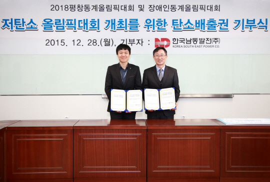 2018년 평창 동계올림픽 및 장애인동계올림픽 조직위원회는 28일 서울 중구 미래에셋빌딩 조직위 서울사무소에서 한국남동발전(주)으로부터 UNFCCC CDM(유엔기후변화협약 청정개발체제)사업 탄소 배출권 6만톤을 기부 받았다. 이날 받은 탄소배출권 6만톤은 1MW급 풍력발전기 약 50기(30%효율)가 1년 간 발전한 효과와 같은 것으로, 한국남동발전(주)이 신·재생에너지 발전 사업에 대한 국제 감축사업 등록 등을 통해 보유한 양이다.