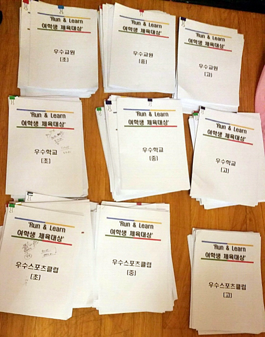 IBK기업은행과 함께하는 2015년 런앤런 여학생체육대상 심사 부문은 초중고 우수학교, 우수 스포츠클럽, 우수교원 등 9개 부문과 후원사인 IBK기업은행 특별상 등 총 10개 부문이었다.