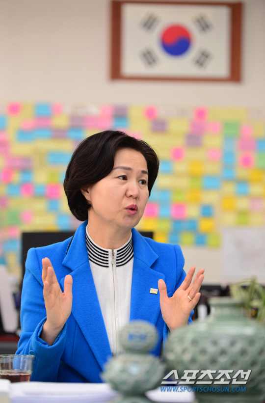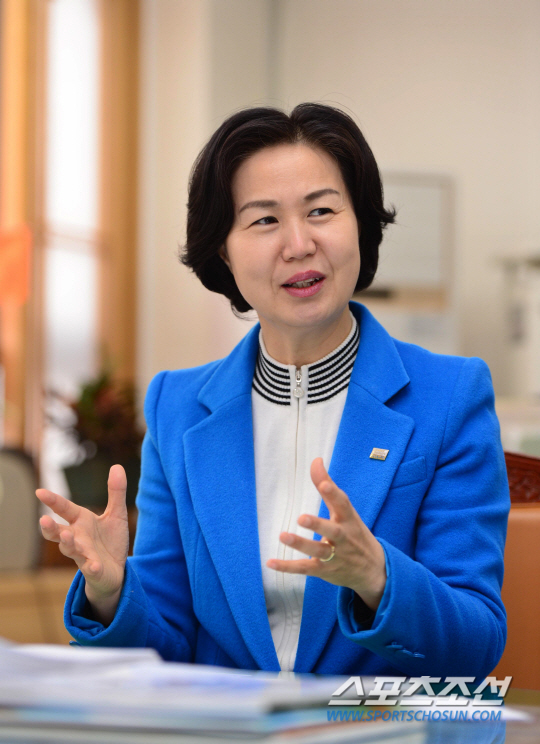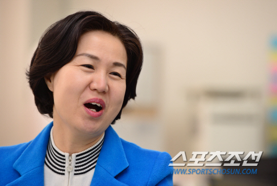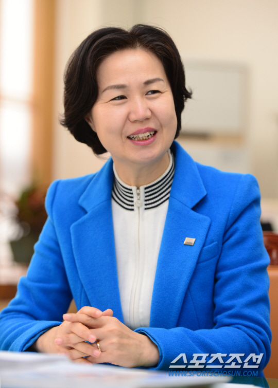 푸른 재킷의 옷깃에 '양성평등(Gender Equality)' 금배지가 반짝였다. 지난 연말 집무실에서 마주한 김수영 양천구청장(52)은 "우리 구 직원들은 늘 이 배지를 달고 다닌다"며 웃었다. 양천구는 2015년 '여성 가족이 행복한 서울 만들기 최우수구'로 선정됐다. 구립어린이집 12개소 확충, 마을 방과후 강사 양성, 여성 취/창업 교육 강화 등 진정성 있는 노력들이 인정받았다. '찾아가는 복지 서울 우수구' '함께 누리는 건강 서울 우수구' 등28개 분야에서 각종 상을 휩쓸며 8억4510만원의 인센티브 상금까지 챙겼다. 1986년 이화여대 총학생회장 출신인 김 청장은 소통의 달인이자, 대한민국을 대표하는 여성 리더다. '관할' 양천구에 위치한 스포츠조선이 추진중인 '여학생 체육 활성화' 캠페인에 반색했다.