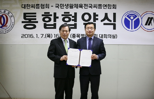 대한씨름협회와 국민생활체육전국씨름연합회가 7일 서울 잠실종합운동장 회의실에서 통합협약식을 가졌다.