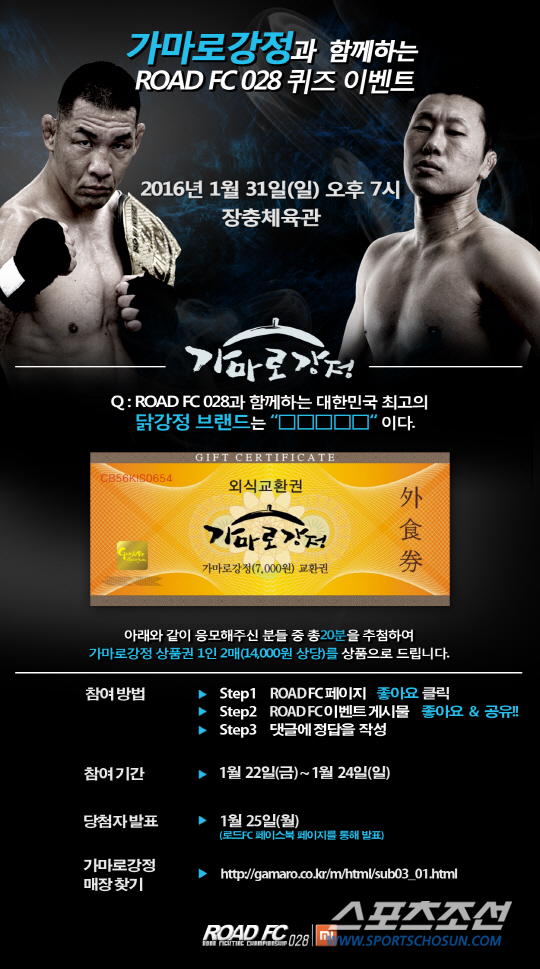 'New Wave MMA' ROAD FC (로드FC)가 가마로강정과 함께 퀴즈 이벤트를 진행한다. 오는 1월 31일 서울 장충체육관에서 열리는 'XIAOMI ROAD FC 028' 개최를 기념한 이벤트다.