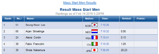 이승훈은 14일 밤(한국시각) 러시아 콜롬나 스피드스케이팅센터에서 열린 2016년 국제빙상경기연맹(ISU) 종목별 세계선수권대회 남자 매스스타트에서 탁월한 경기운영에 힘입어 7분18초 26으로 24명의 출전선수 중 당당히 1위에 올랐다. 네덜란드의 아르연 스트뢰팅가(7분18초32), 프랑스의 알렉시스 콩탱(7분18초41)이 2-3위에 올랐다.